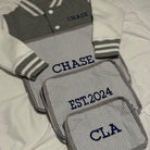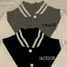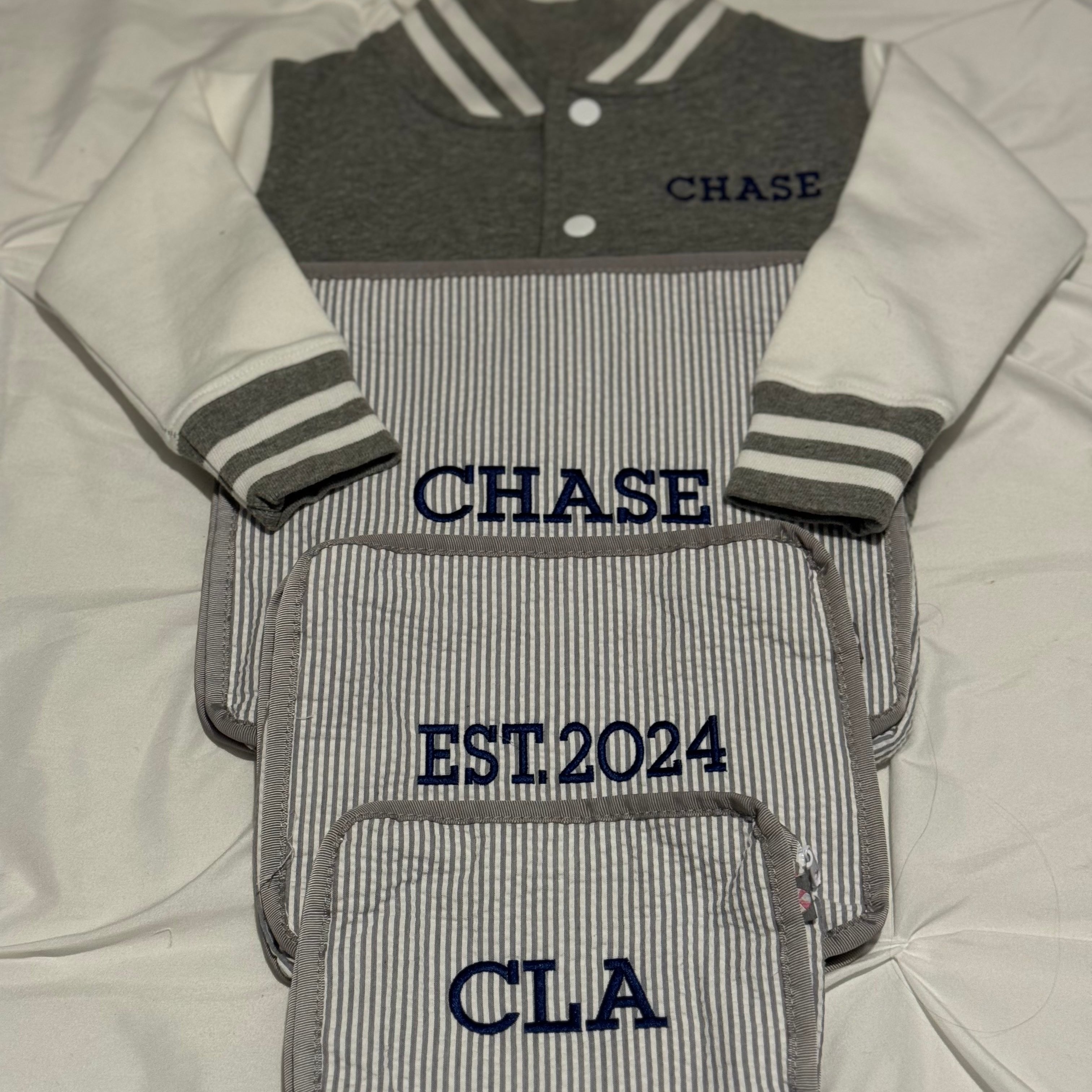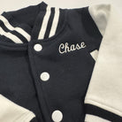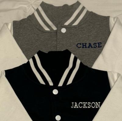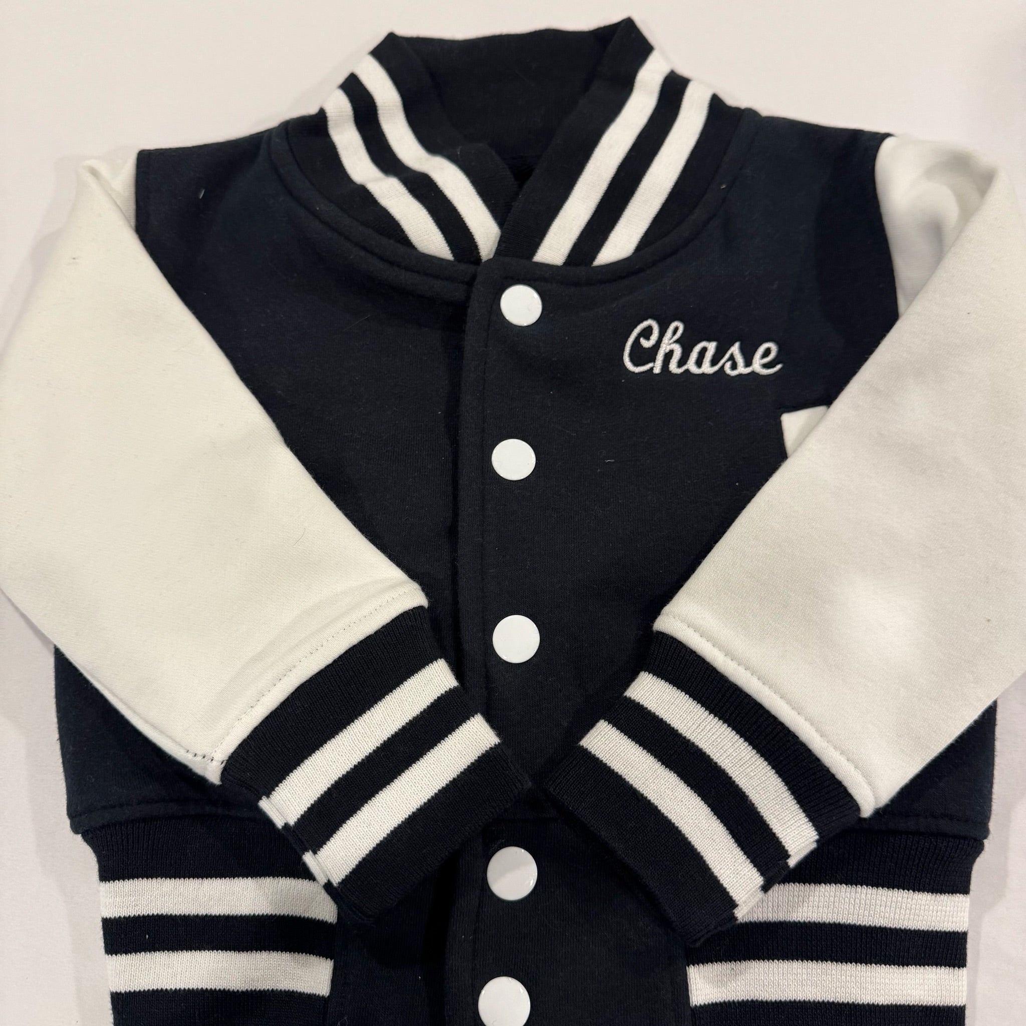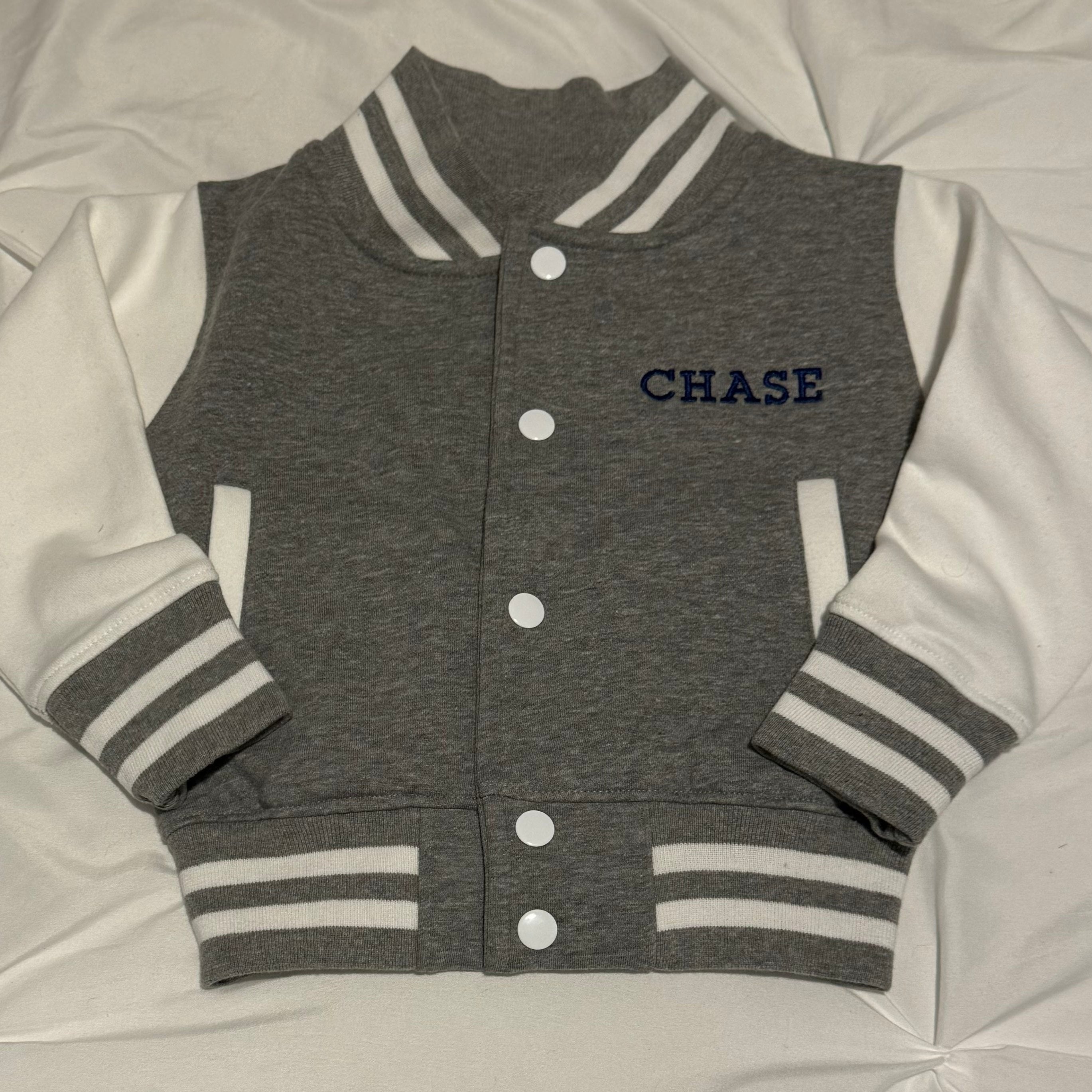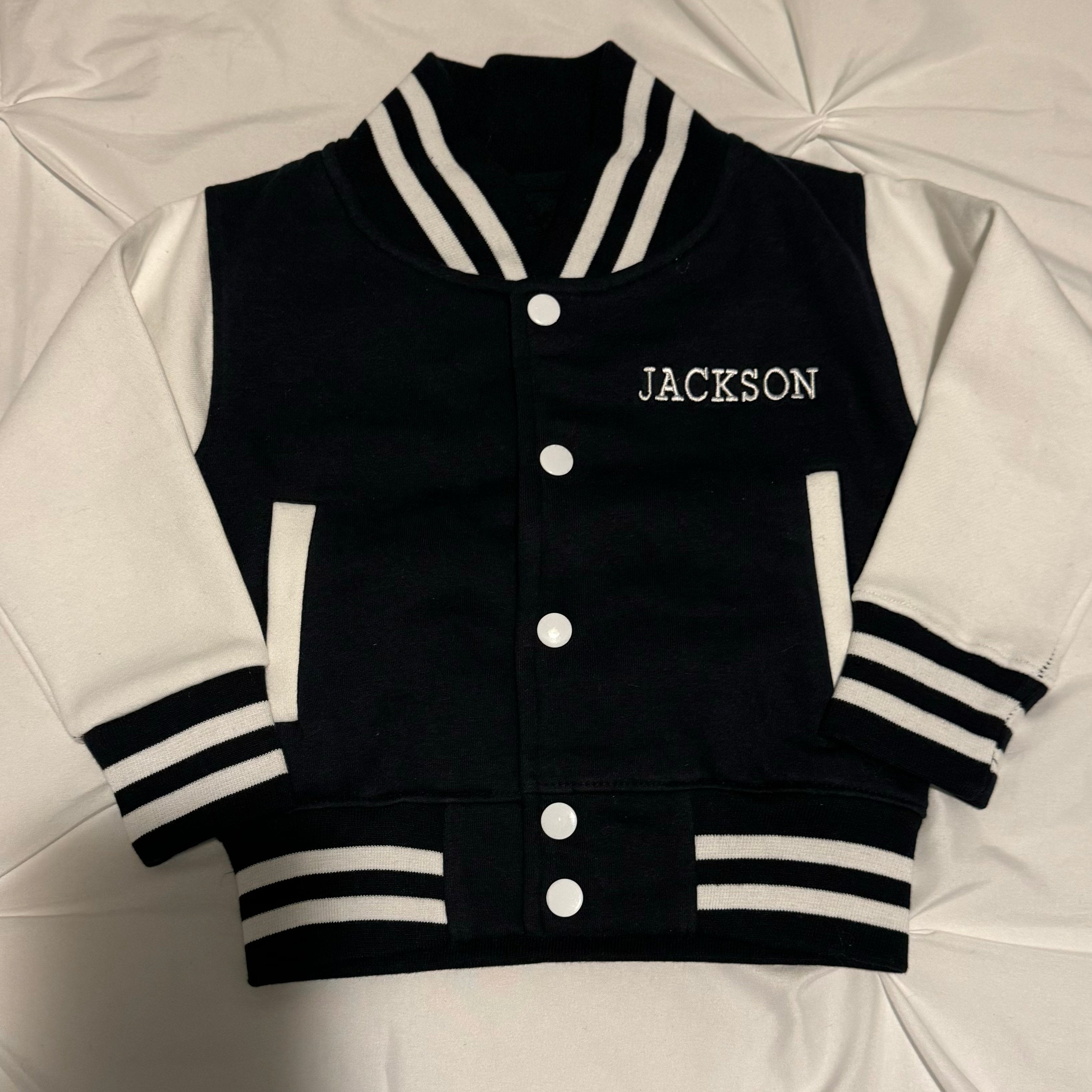 Our own embroidered Varsity jacket is the perfect gift for the little ones. Perfect for new baby, toddler, birthday, special occasion. Material is a fleece/sweatshirt fabric.