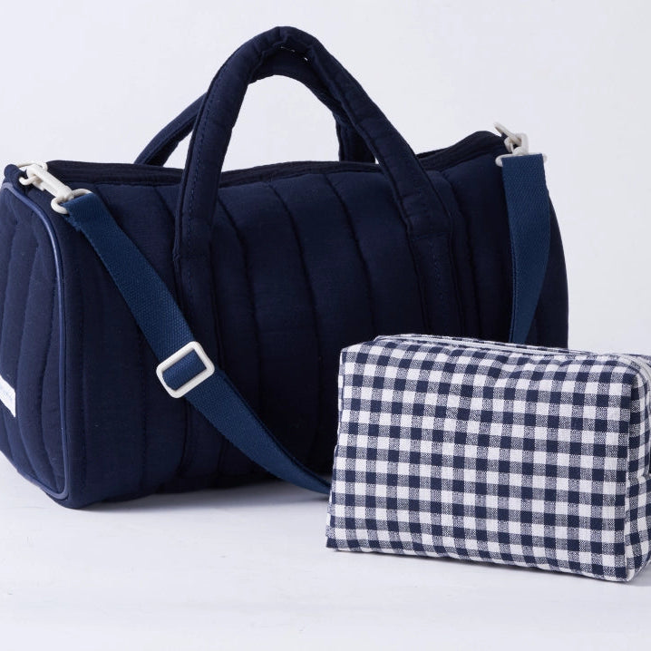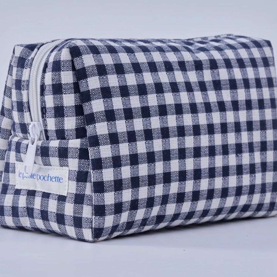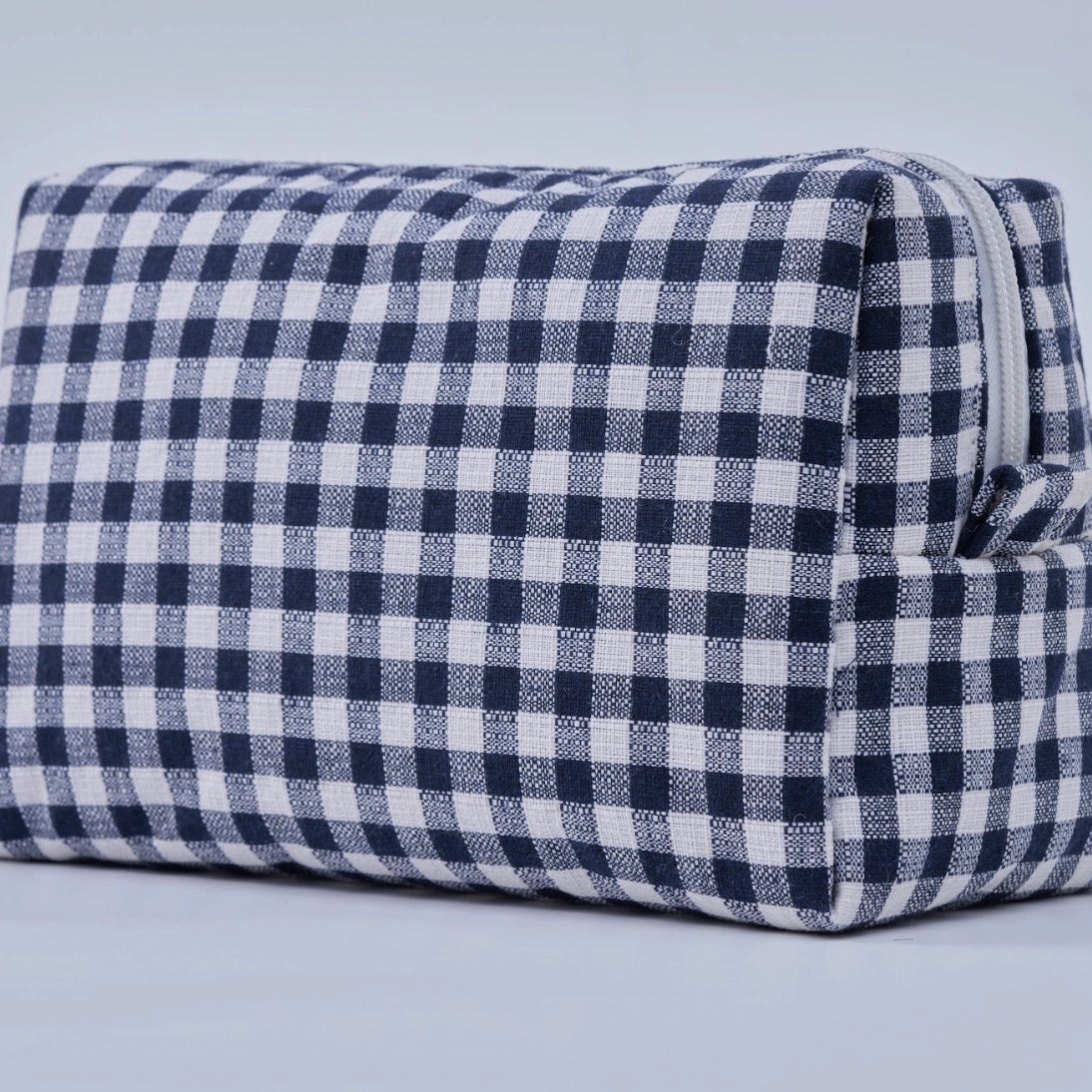 A fresh take on a timeless classic, our Navy Gingham pouch pairs crisp blue-and-white checks with quilted detailing to create a sophisticated yet casual companion for all your everyday basics. Material: Crepe Fabric with Nylon Zipper Dimensions: 9.5 x 5.1 x 4.7