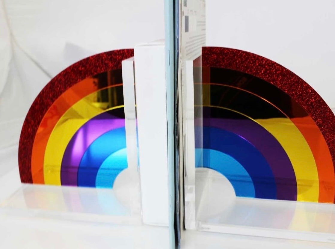 Acrylic Rainbow bookends look great on any bookcase, shelf & dresser. A sweet baby gift, birthday gift or for the avid reader that loves rainbows. Can't go wrong. Available in prime rainbow colors, silver rainbow, pink rainbow & blue rainbow. All bookends are made to order.