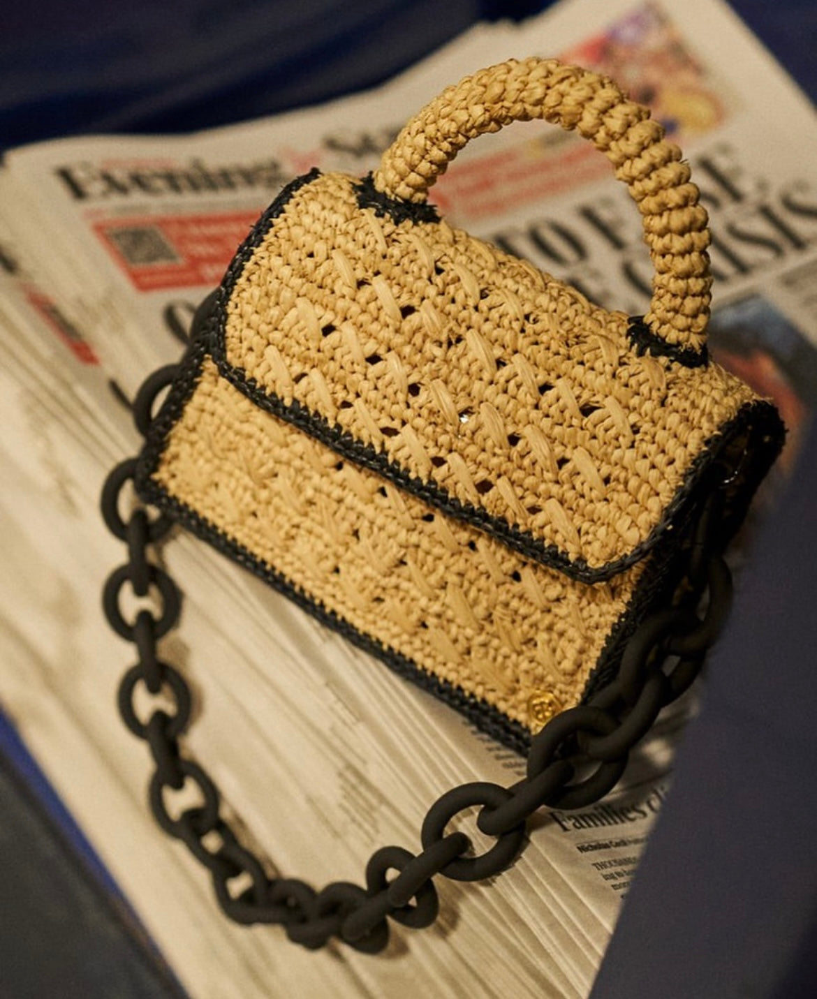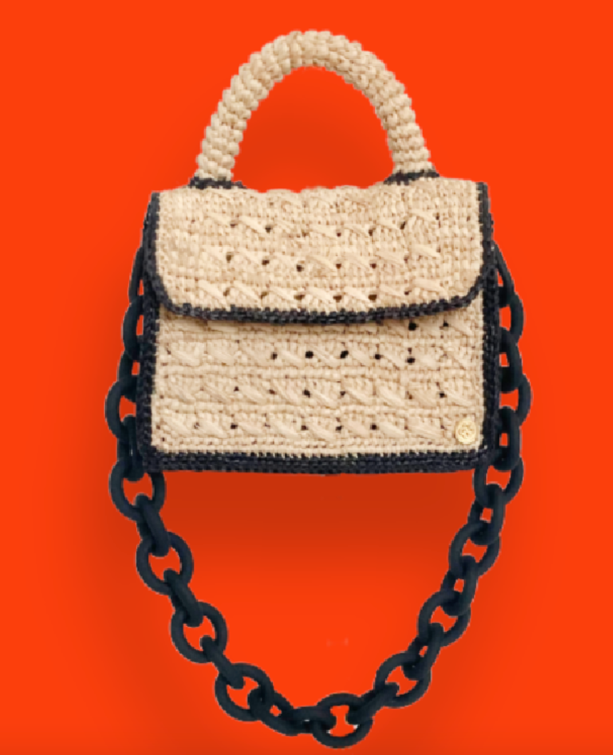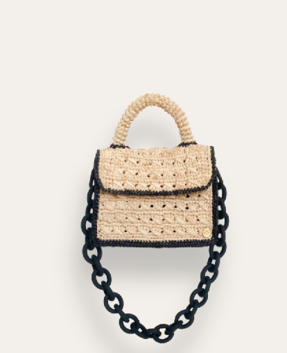 Sanabay Mini Raffia Bag Felicie With Metallic Chain & Crocheted Strap -Natural & Black