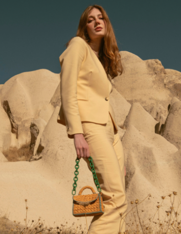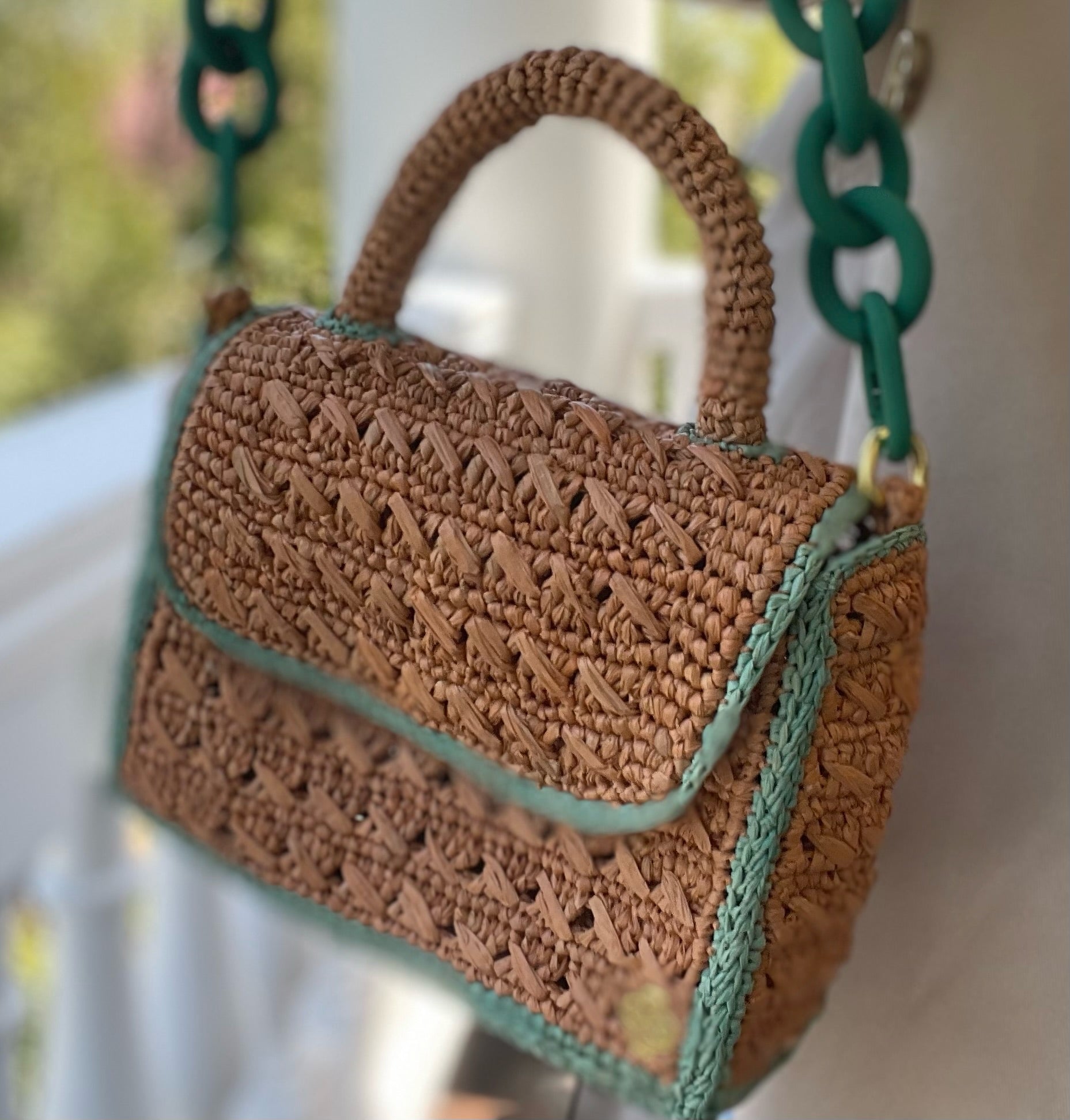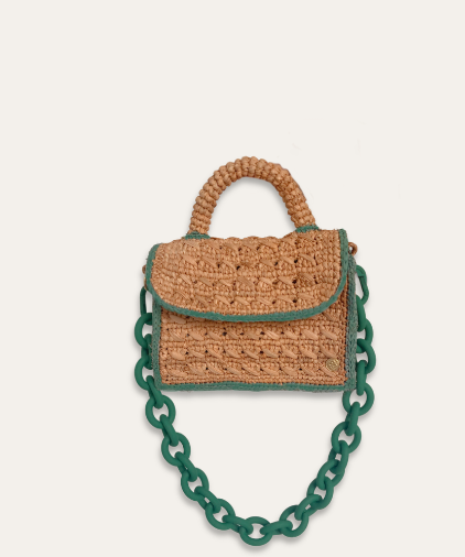 Sanabay Mini Raffia Bag Felicie With Green Metallic Chain & Crocheted Strap - Papaya & Green