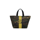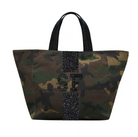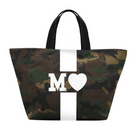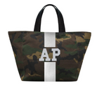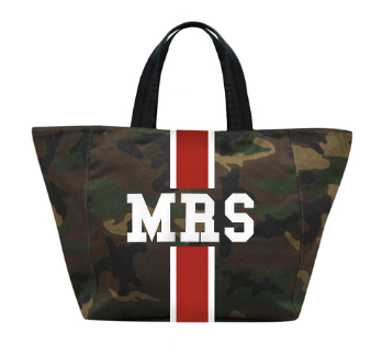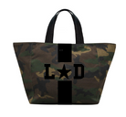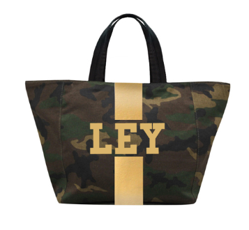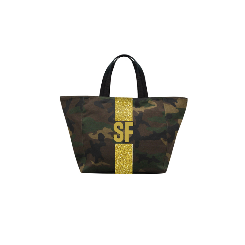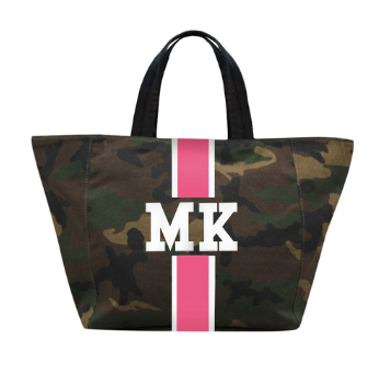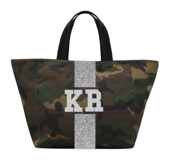 Camouflage tote customizable with 1-3 letters, ★, &, ♥. Letters shrink with increase of letter count. Available in various colors in solid or classica styles.