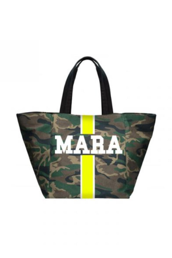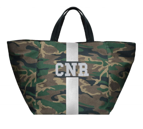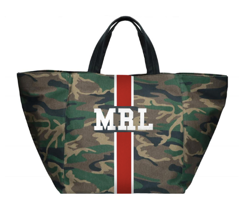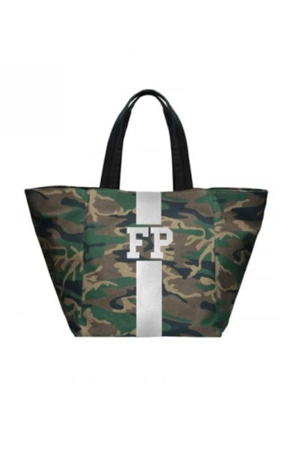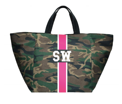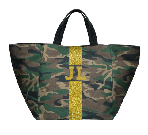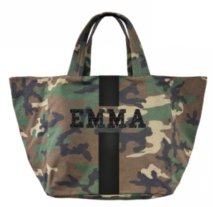 Camouflage tote customizable with 1-5 letters, ★, &, ♥. Letters shrink with increase of letter count. Available in various colors in Solid or Classica styles. Custom made in Italy. Please allow 4-6 weeks for delivery.