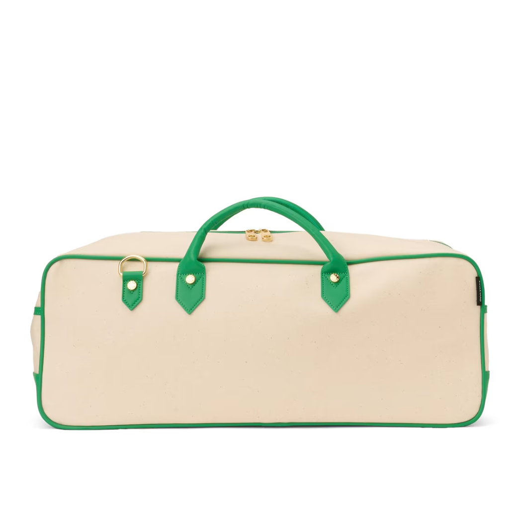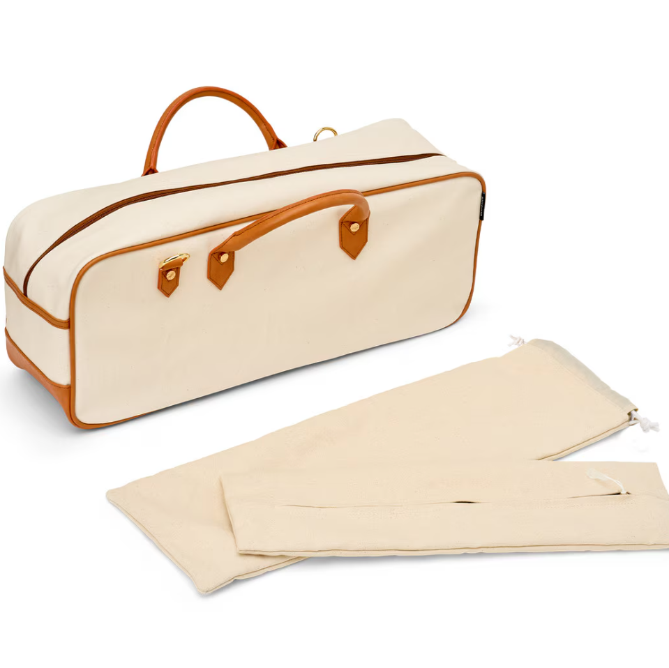 The stylish way to store and carry your mahjong tiles, racks and accessories. Made of a durable canvas and vegan accents. The Margo comes with a zippered bag for your tiles and a drawstring bag for racks.