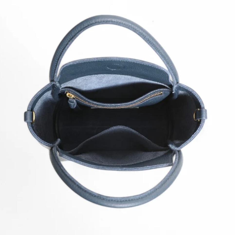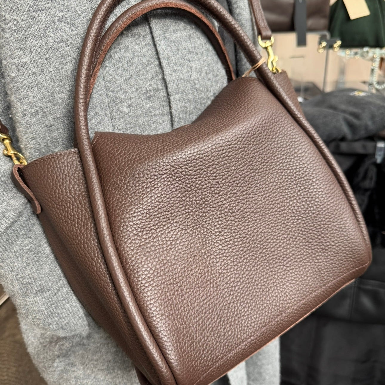 The Serena Satchel Crossbody in Italian Buffalo Cowhide, a full grain Italian leather with a pebbled texture and buttery hand feel It has 5" inch Top Handle Drop, Double Flap with Invisible Magnetic Snap Closure, Unlined with Interior Zipper Pocket and Open Pocket &Solid Brass Hardware. Detachable Crossbody Strap'