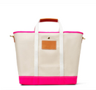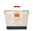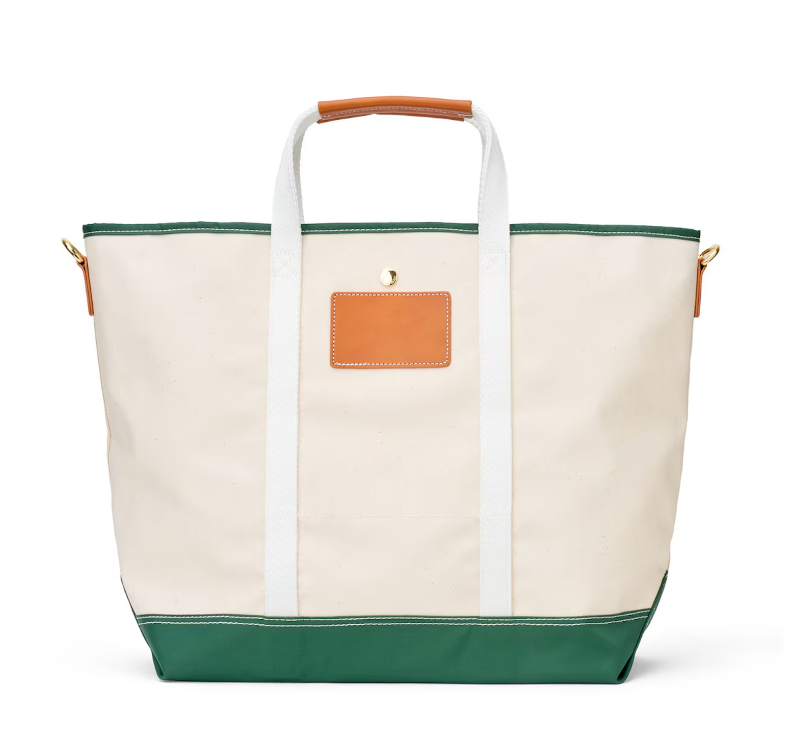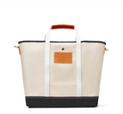 A coated canvas tote just big enough to take everywhere. Features a detachable shoulder strap, leather wrapped handles, and a strap to slide over luggage handles.