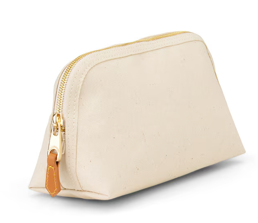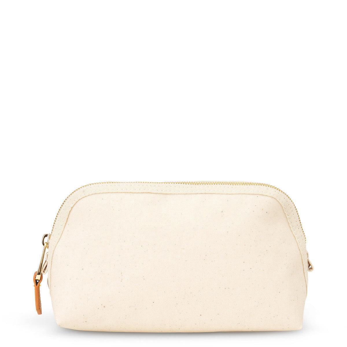This pouch is made using our signature coated canvas that is water and dirt resistant and features gold toned zipper and a leather pull tab.