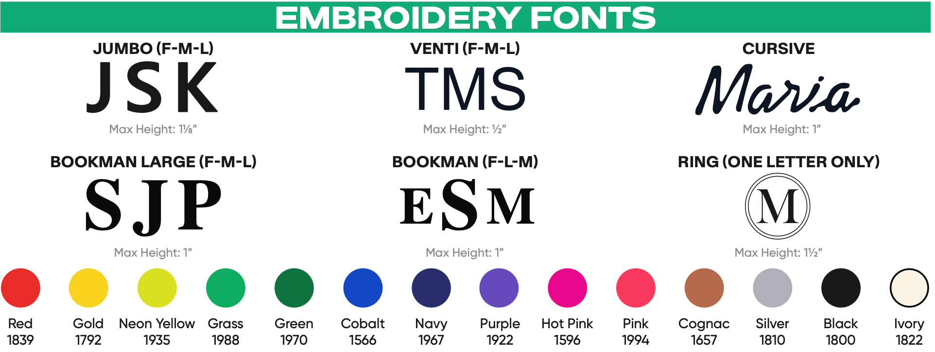 PLEASE SEE CHART AND ENTER EMBROIDERY OPTION IN NOTES. FONT STYLE, INITIALS OR NAME AND COLOR.