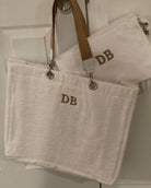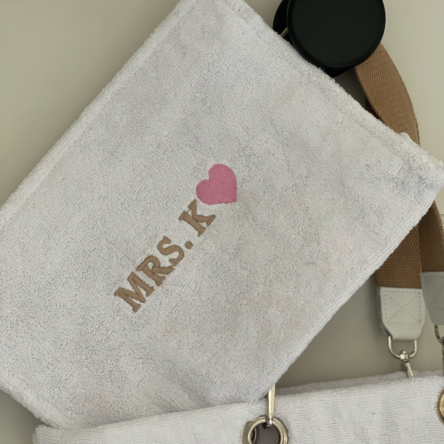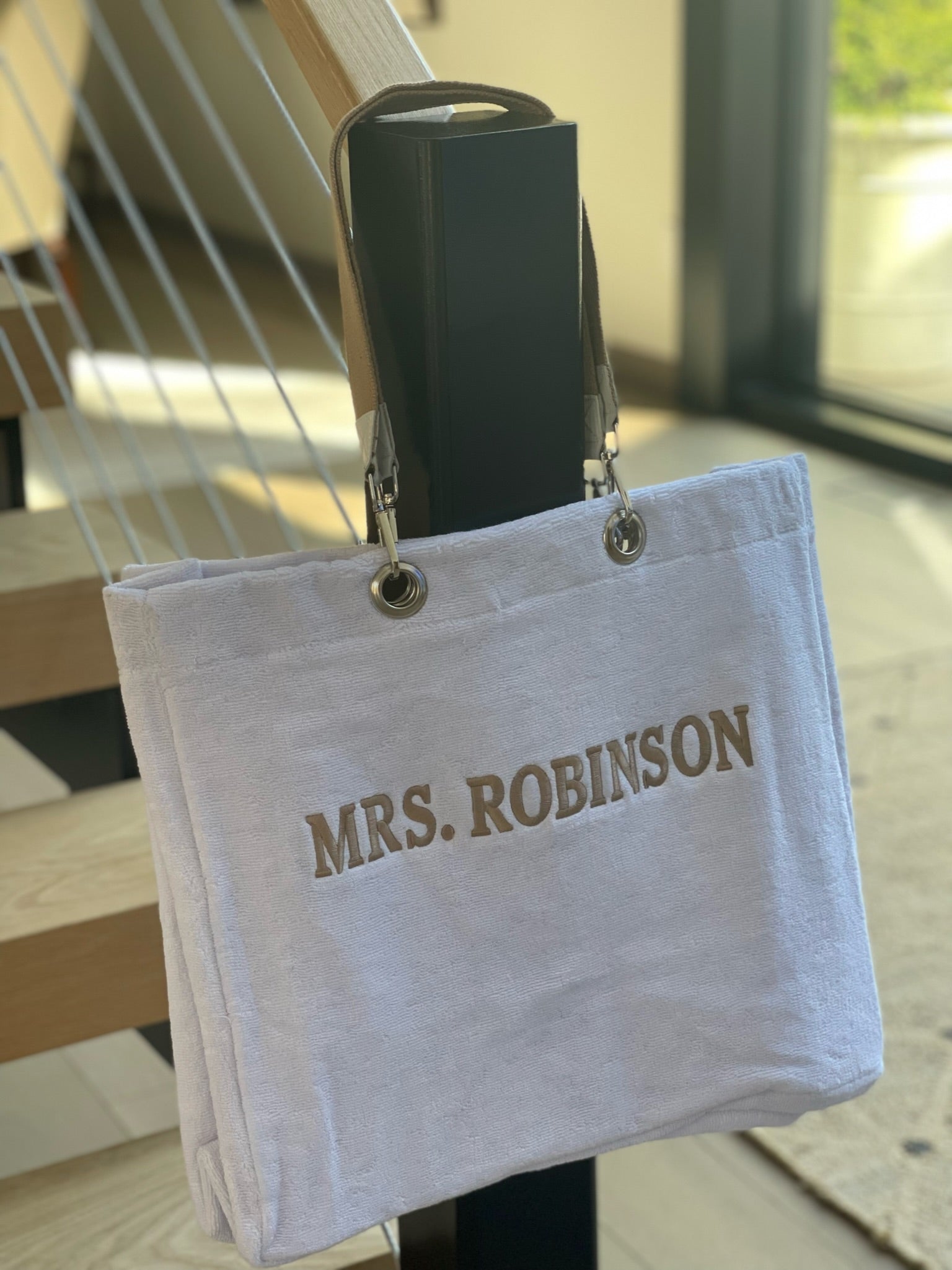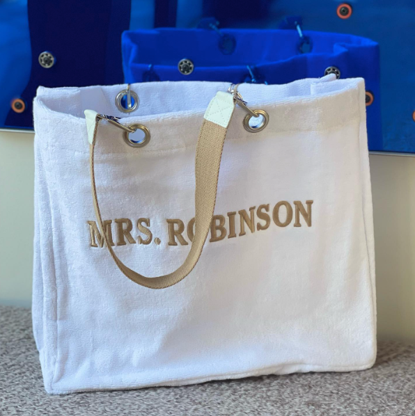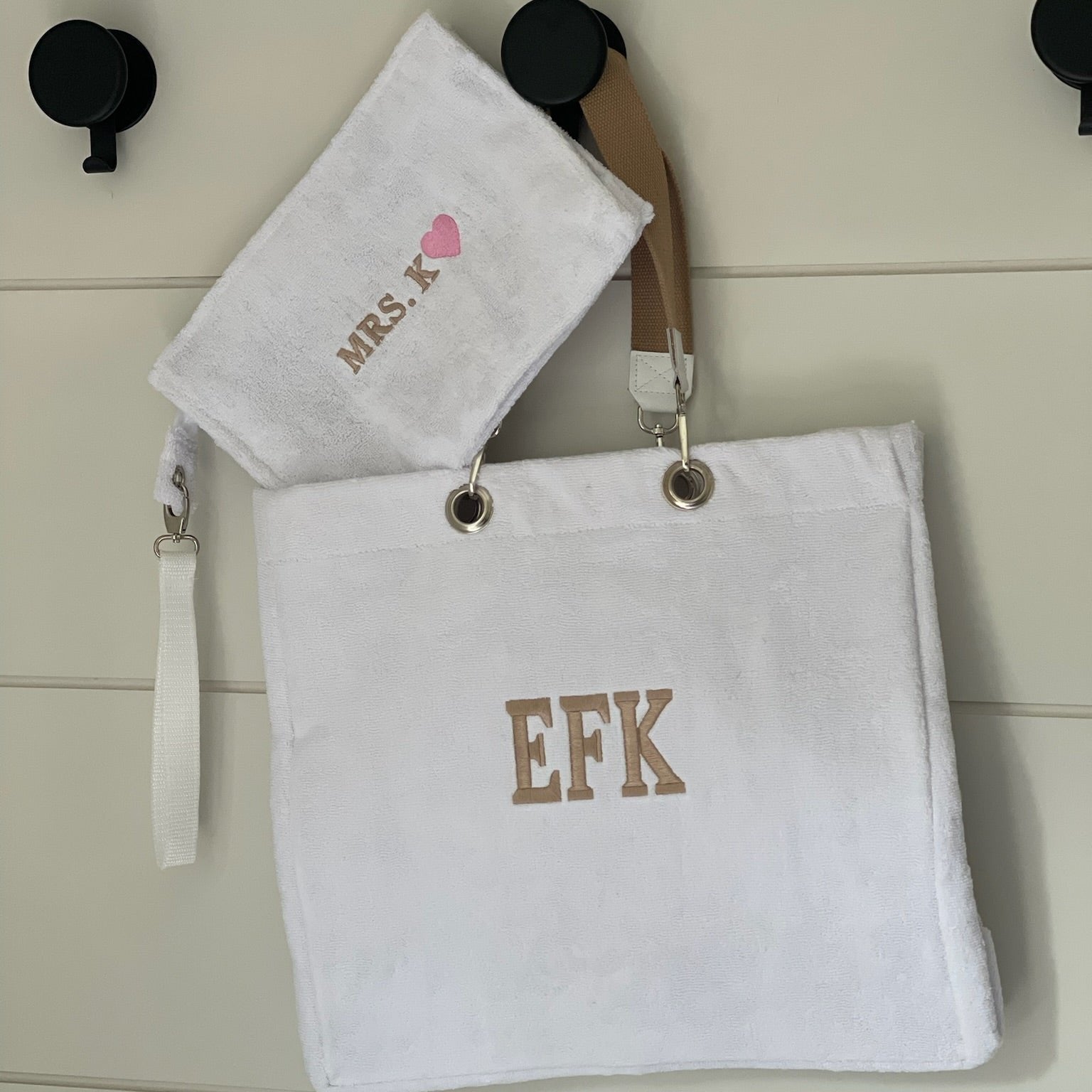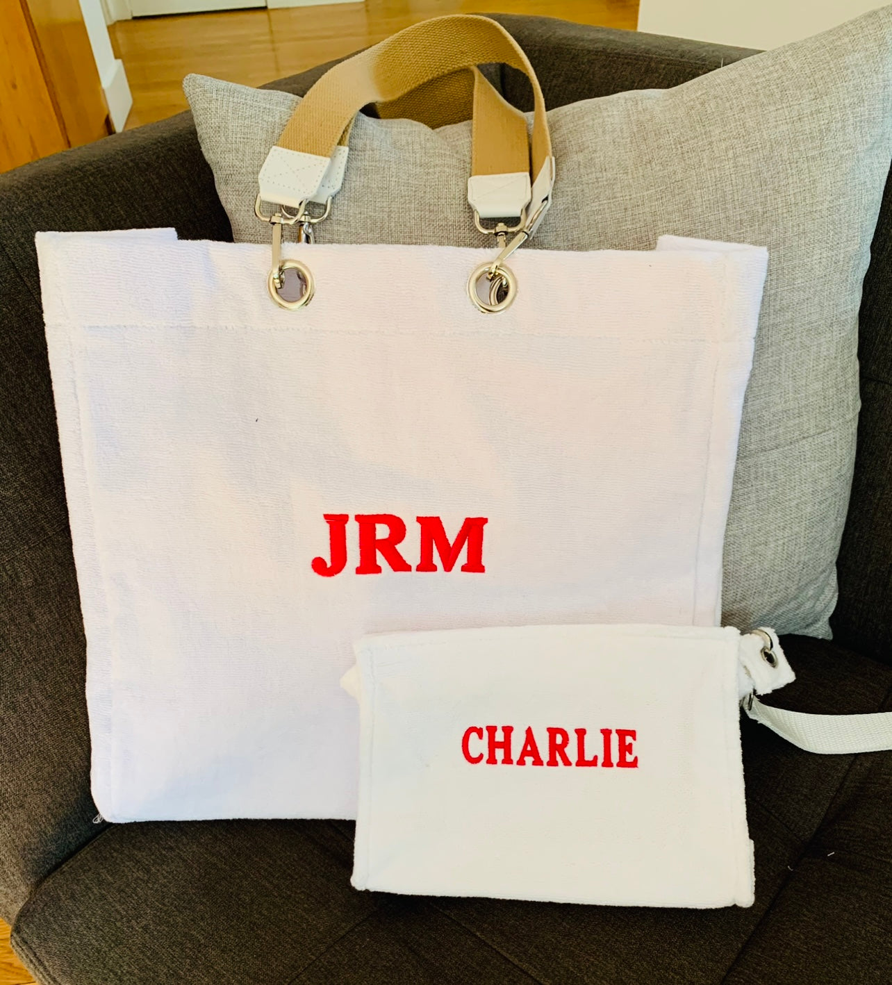 Terrycloth tote bag with embroidered name or monogram. Please allow a couple of weeks for custom order. Email info@designsthatdonate.com for any questions.