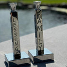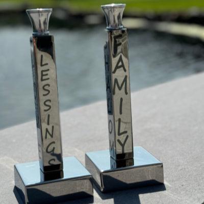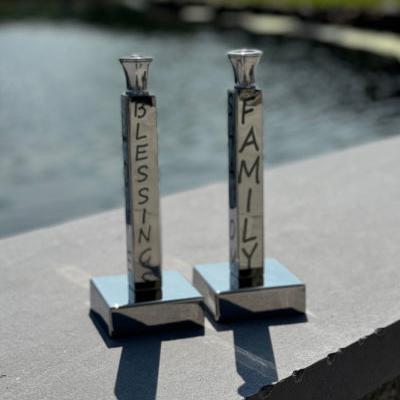 Add a little Sabbath sparkle with our beautiful candlesticks. Each candlestick is designed to bring a heartfelt smile with meaningful words: Family, Gratitude, Love, Memories, Blessings & Traditions! Makes a great engagement, wedding or hostess gift as well as a beautiful addition to a shelf or fall home decor display. Made of food-safe polished aluminum with stainless steel candle cups. Candles not included. Size: 8.75" x 3.25"