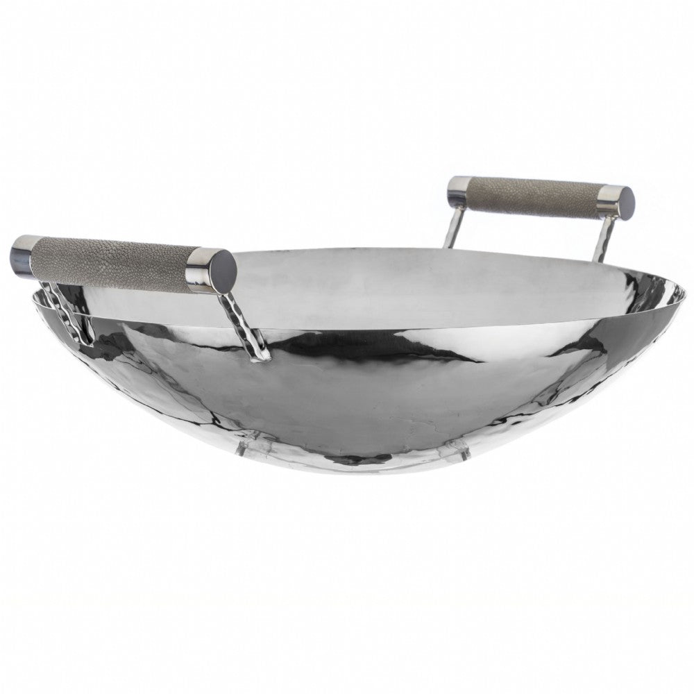 Hand made, hammered stainless steel round bowl. Custom genuine shagreen covered inlay handles. Dimensions: 16 X 16"