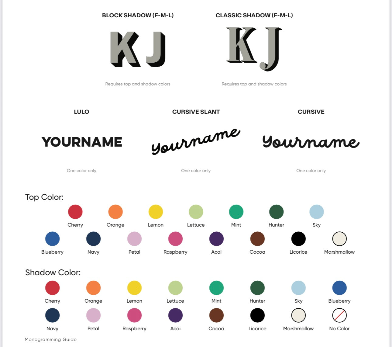 Bottom Shadow Color Options: NO COLOR, Blueberry, Cherry Red, Lemon Yellow, Lettuce Green, Black, Mashmallow, Mint Green, Navy, Orange, Petal Purple, Raspberry, Sky
