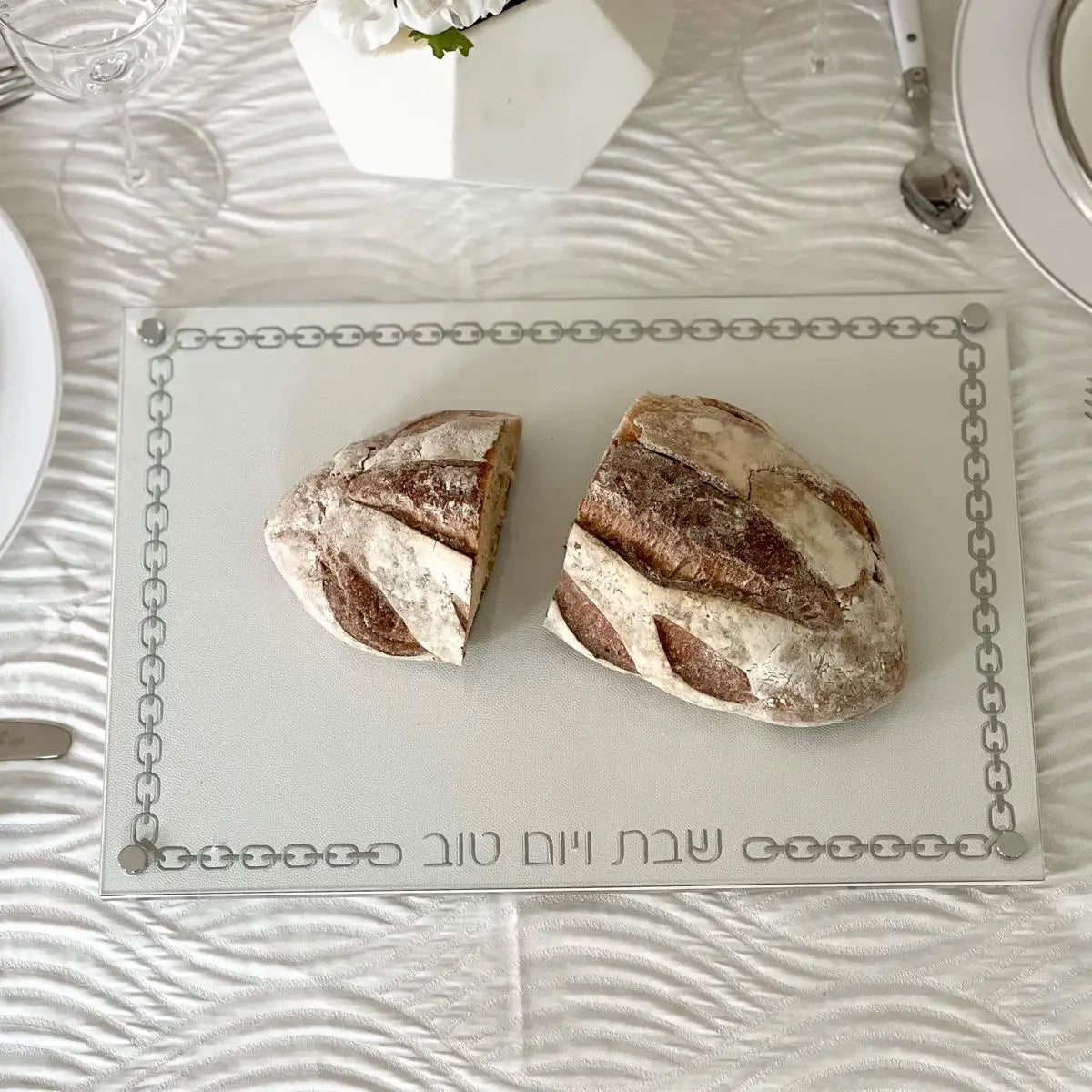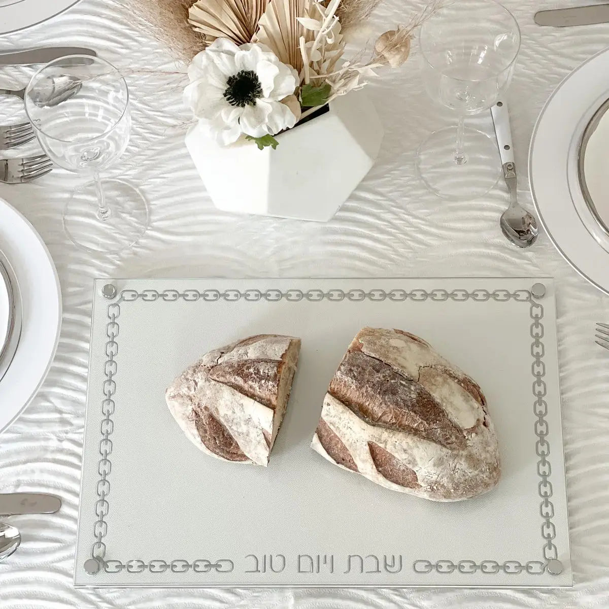 Glass Challah Board with Chain Design Embroidered Leatherette White with Silver