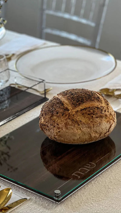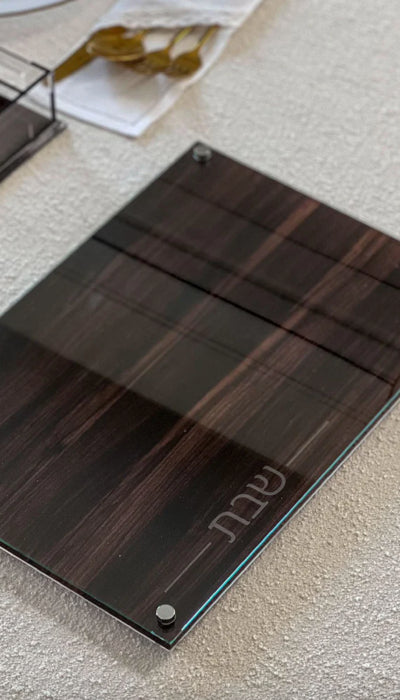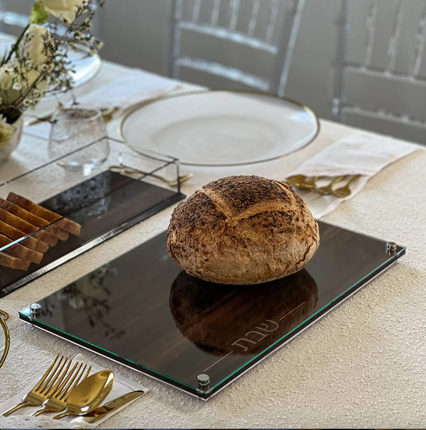 Glass Challah Board with Chain Design Embroidered Leatherette White with Silver