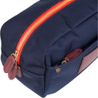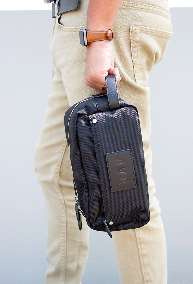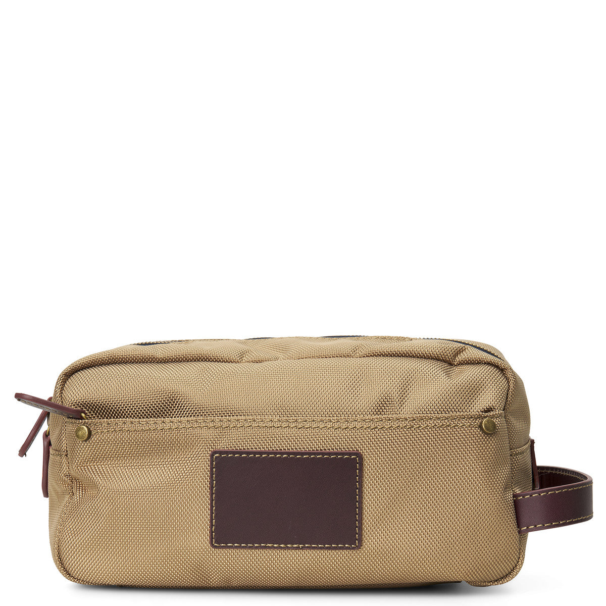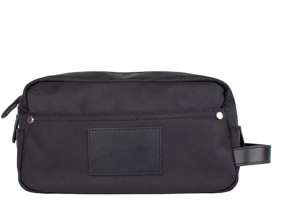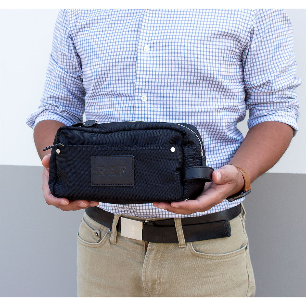 The smarter dopp kit. Our handsome Dennis Dopp Kit is made of water resistant ballistic nylon with leather trim and features an exterior pocket, an interior pocket, and a mesh gusseted pocket for keeping things in their place. All pockets are lined and can be wiped clean with a sponge. All stamped items are final sale.