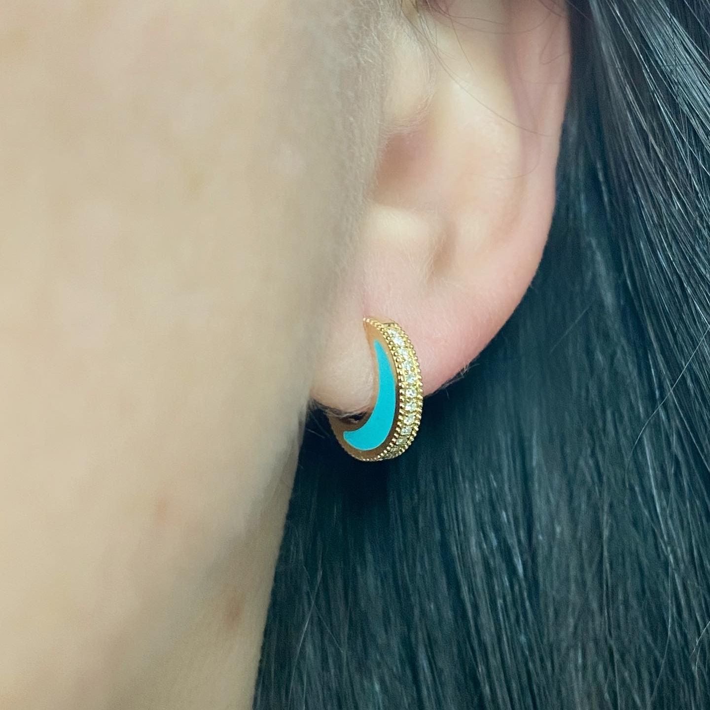 14k Yellow Gold Turquoise Half Moon Diamond Mini Hoops