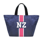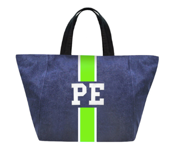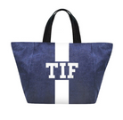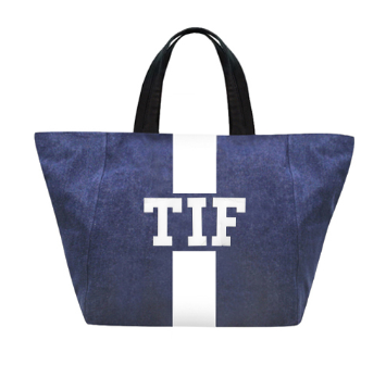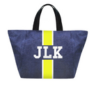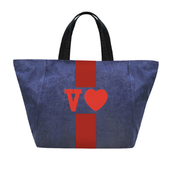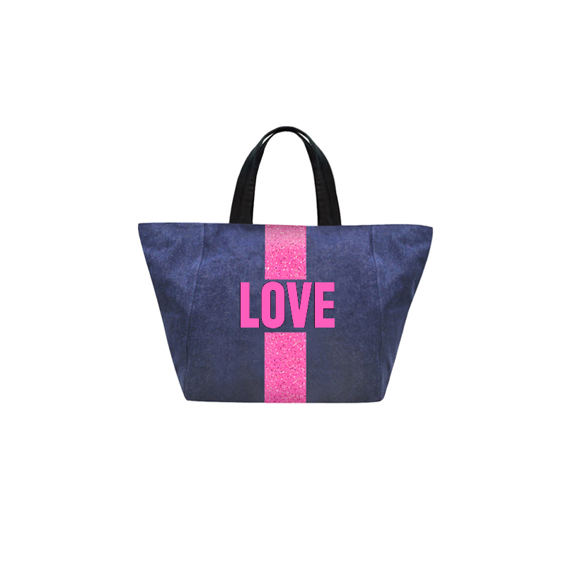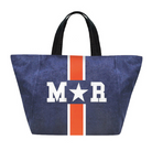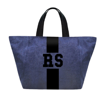Denim tote customizable with 1-3 letters, ★, &, ♥. Letters shrink with increase of letter count. Available in various colors in solid or classica styles.