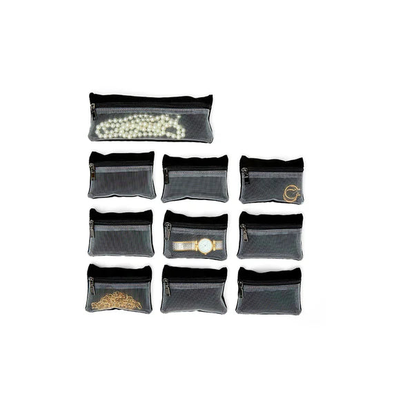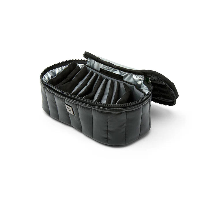 Our signature quilting adorns this beauty of a structured bag with a web top handle.  The inside reveals individual pouches made of suede soft fabric and mesh to keep multiple jewels separated yet together!
