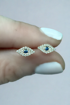 14K Yellow Gold Pave Diamond Evil Eye Studs with Blue Sapphire