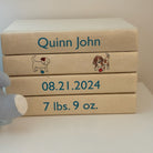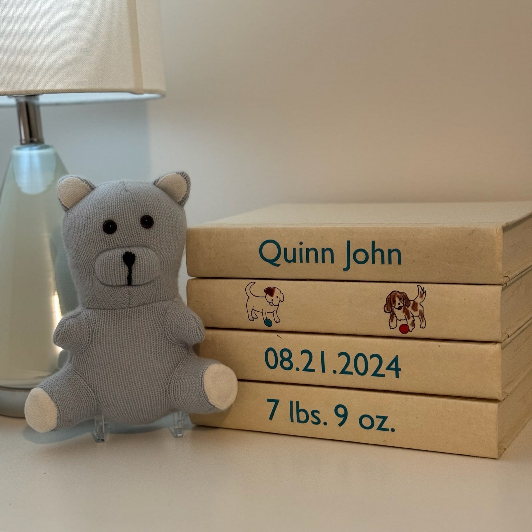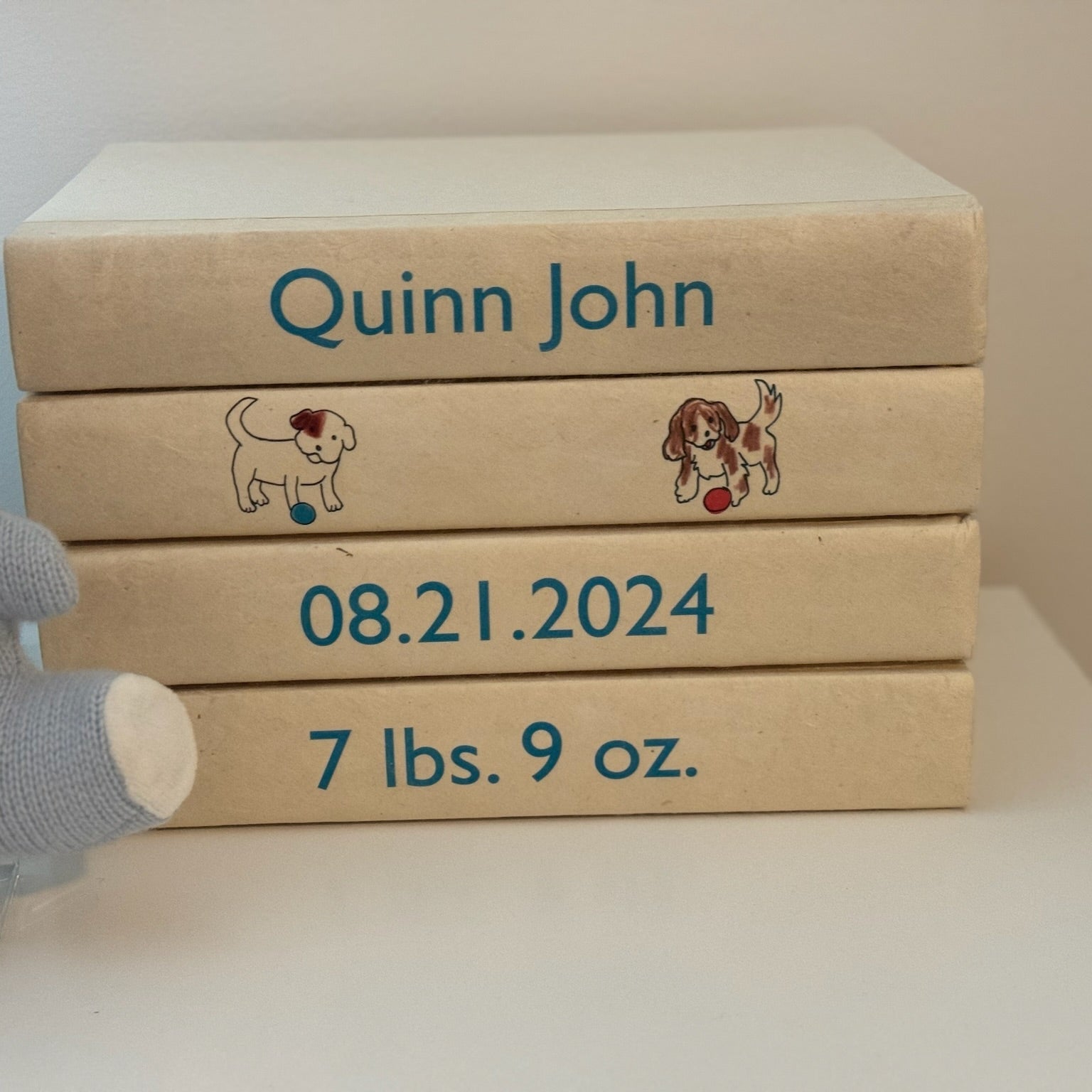 The Custom baby boy decorative book stack. A beautiful gift!! Each book has off white covers. Beautiful record of Name, birth date, weight and length. Made complete with puppy illustrations.