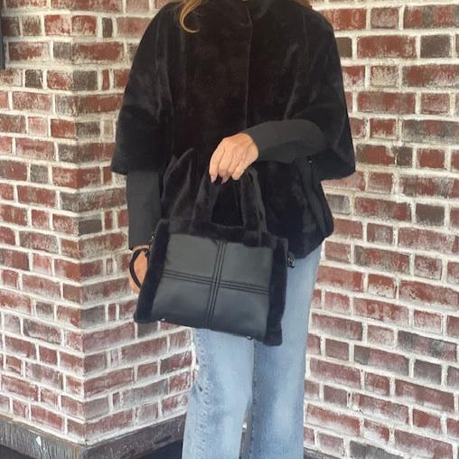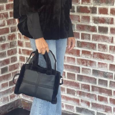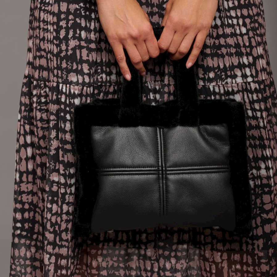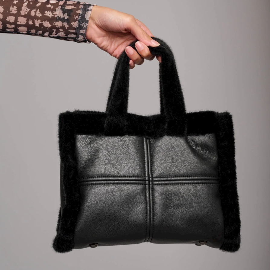 The small leather shopper in Black with faux fur details. This stylish shopper features two short top handles, stitched details, a snap-fastening at the open top, a pocket on the inside with a zipper closure and a detachable bag strap. The inside of the bag is made of a faux fur material. It's the perfect bag to finish your look and to fit all your essentials.