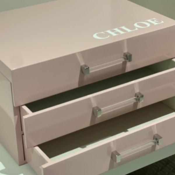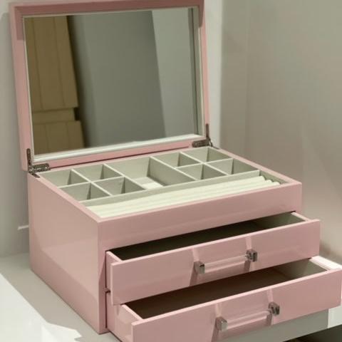 Our Jewelry Box is simple, sleek and modern. This mid-century-inspired jewelry box is a dashing way to store your stuff. The box is designed with an open top and two lower pull out drawers with acrylic handles. Finished with high gloss lacquer. Plain, or with customization. Pink or White
