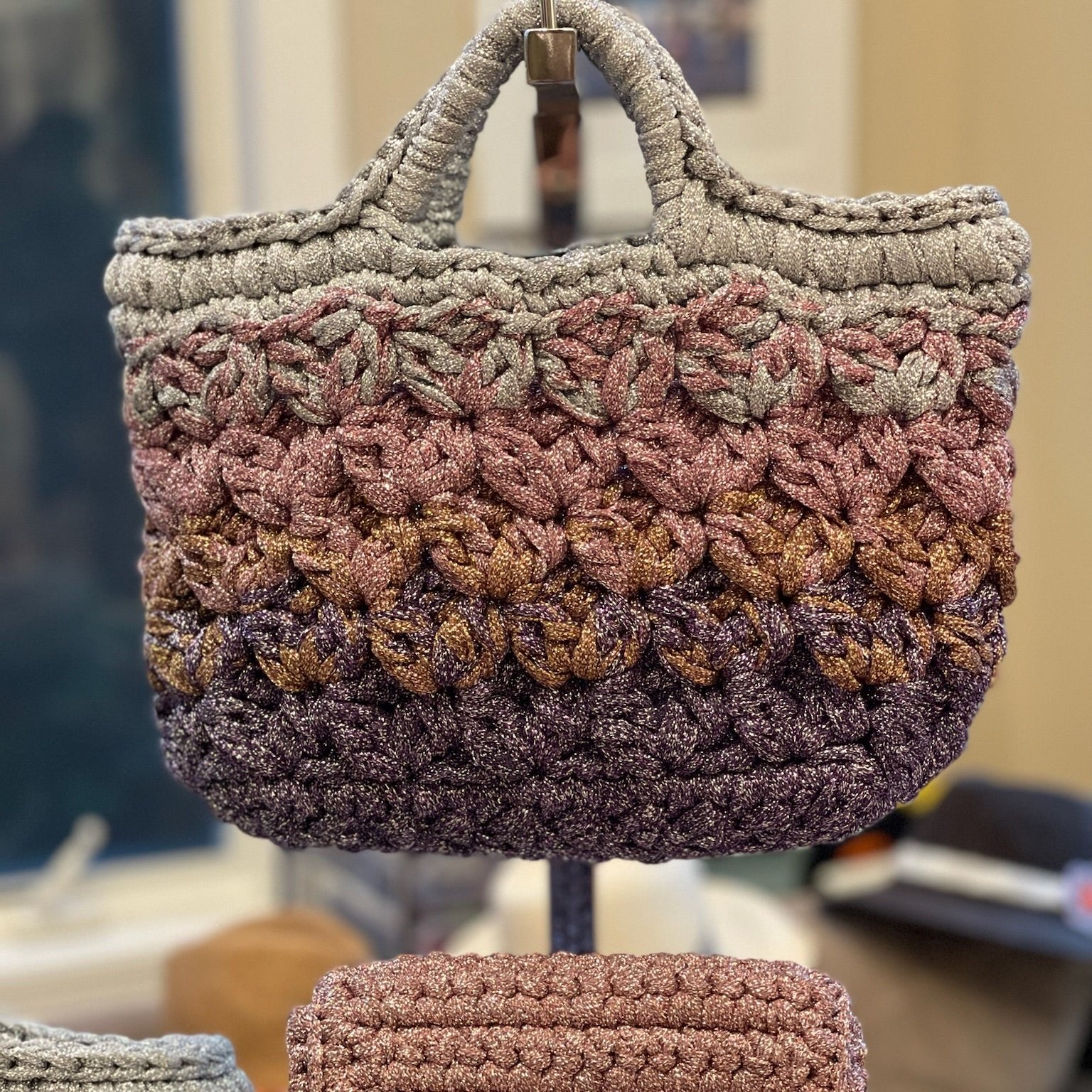 Crocheted Lilac & Silver Lurex Lace Basket Bag