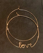 DTD Exclusive! Yellow gold hand wire-wrapped cursive hoop earrings. 'Love' written on one single hoop. Available in small for $150 or large for $175. Pictured above in the small and large for size contrast. For a word on both hoops, please contact us to custom order.