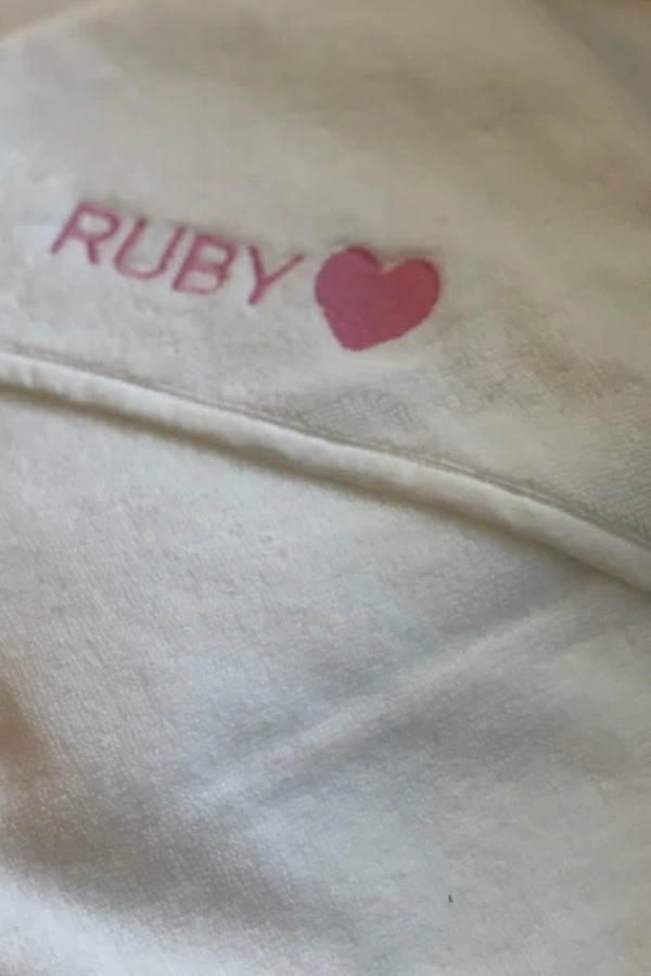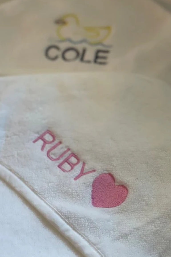 We LOVE our personalized hooded towels. Made of 100% cotton, they are soft and cozy for your little ones. Machine washable. One Size.