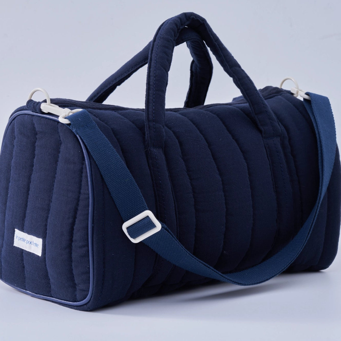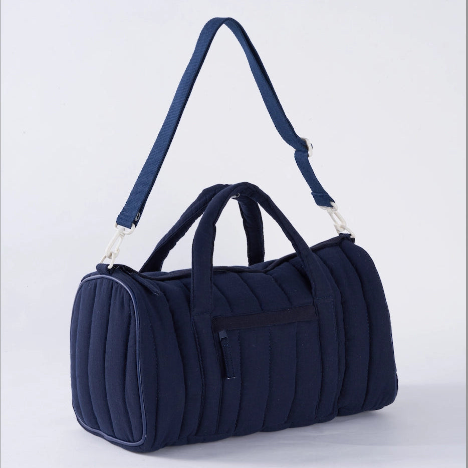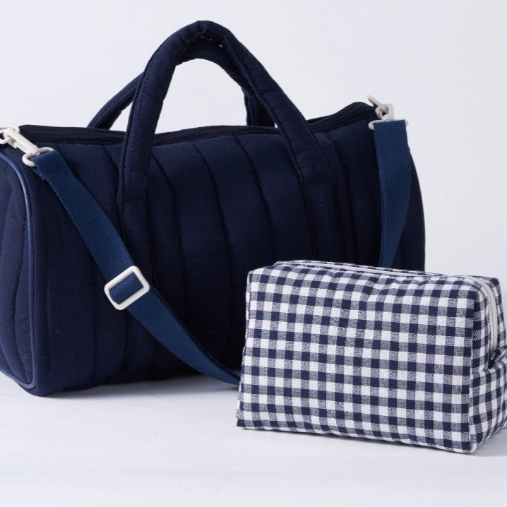 The sophisticated Navy Duffle, featuring plush quilted cotton and a cheerful gingham-lined interior, pairs perfectly with our Navy Gingham Toiletry Bag for a coordinated and polished travel set that combines classic design with practical organization.