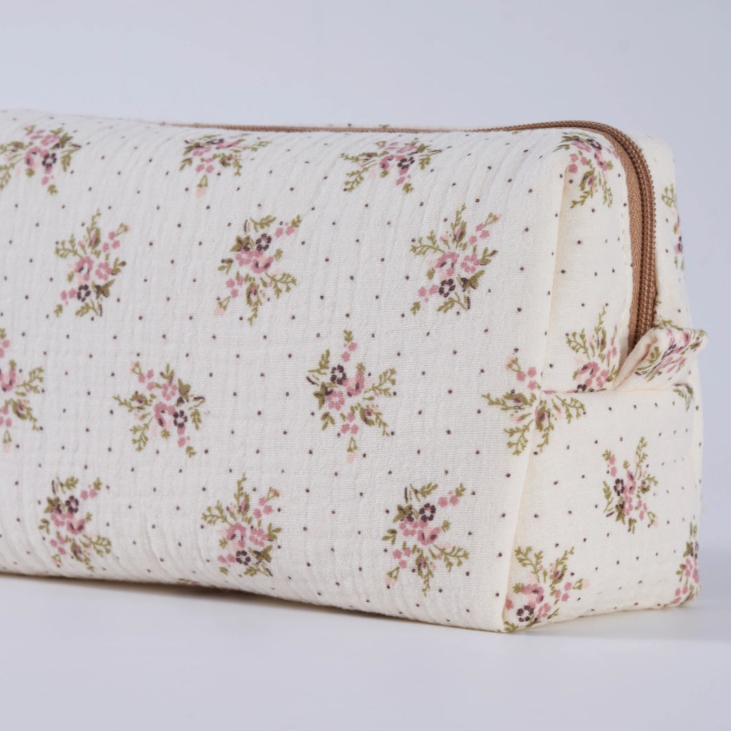 Delicate vintage-inspired florals bloom across Baby Breathes, our cream cotton pouch dotted with sweet pink roses and sage green leaves. Finished with a coordinating light brown zipper, this classic rectangular pouch offers the perfect sanctuary for your little one's everyday essentials, combining nursery-ready aesthetics with practical charm. Material: Crepe Fabric with Nylon Zipper Dimensions: 9.5 x 5.1 x 4.7