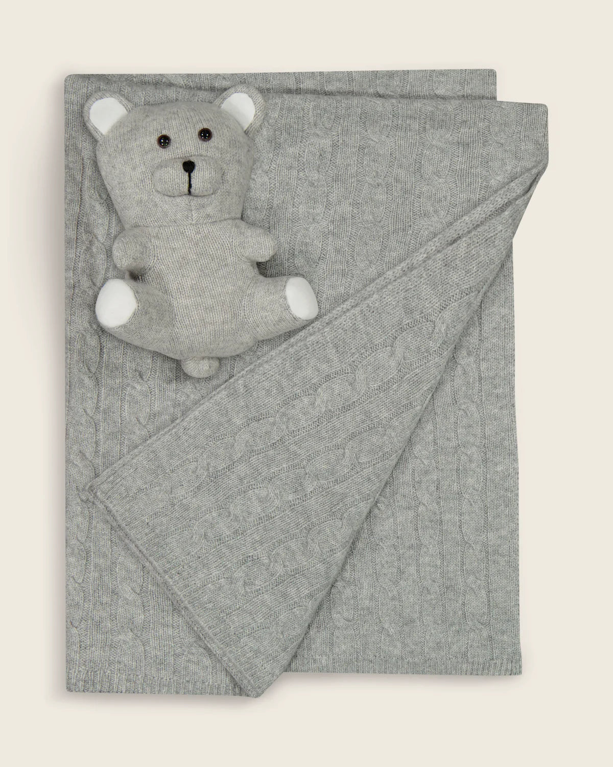 Made from the finest cashmere, this set brings comfort and warmth to your little one. The soft cashmere teddy bear offers endless cuddles and a sense of security, while the cable knit baby blanket is perfect for cribs, strollers, and snuggling. Lightweight and cozy, the blanket ensures comfort during naps and outings and adds timeless elegance to any nursery.